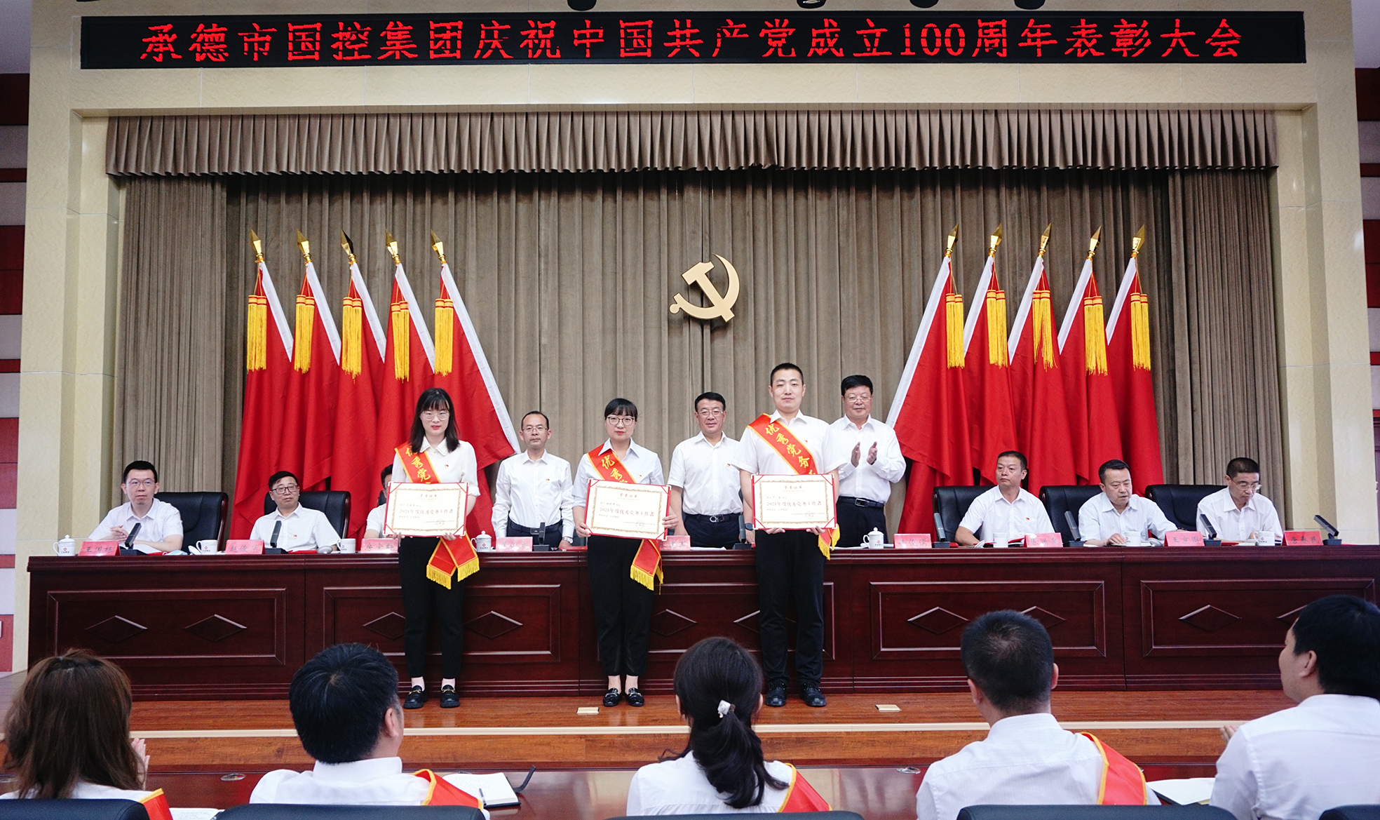 表彰大會氣氛隆重熱烈,大會在全場起立高唱國歌聲中開幕。集團公司黨委決定,授予許平凡等7名共產(chǎn)黨員“優(yōu)秀共產(chǎn)黨員”稱號,授予胡斌偉等3名黨務工作者“優(yōu)秀黨務工作者”稱號?,F(xiàn)場向先進個人頒發(fā)了證書,并向參加“慶祝中國共產(chǎn)黨成立100周年書畫攝影大賽”獲獎的人員頒發(fā)了榮譽證書。