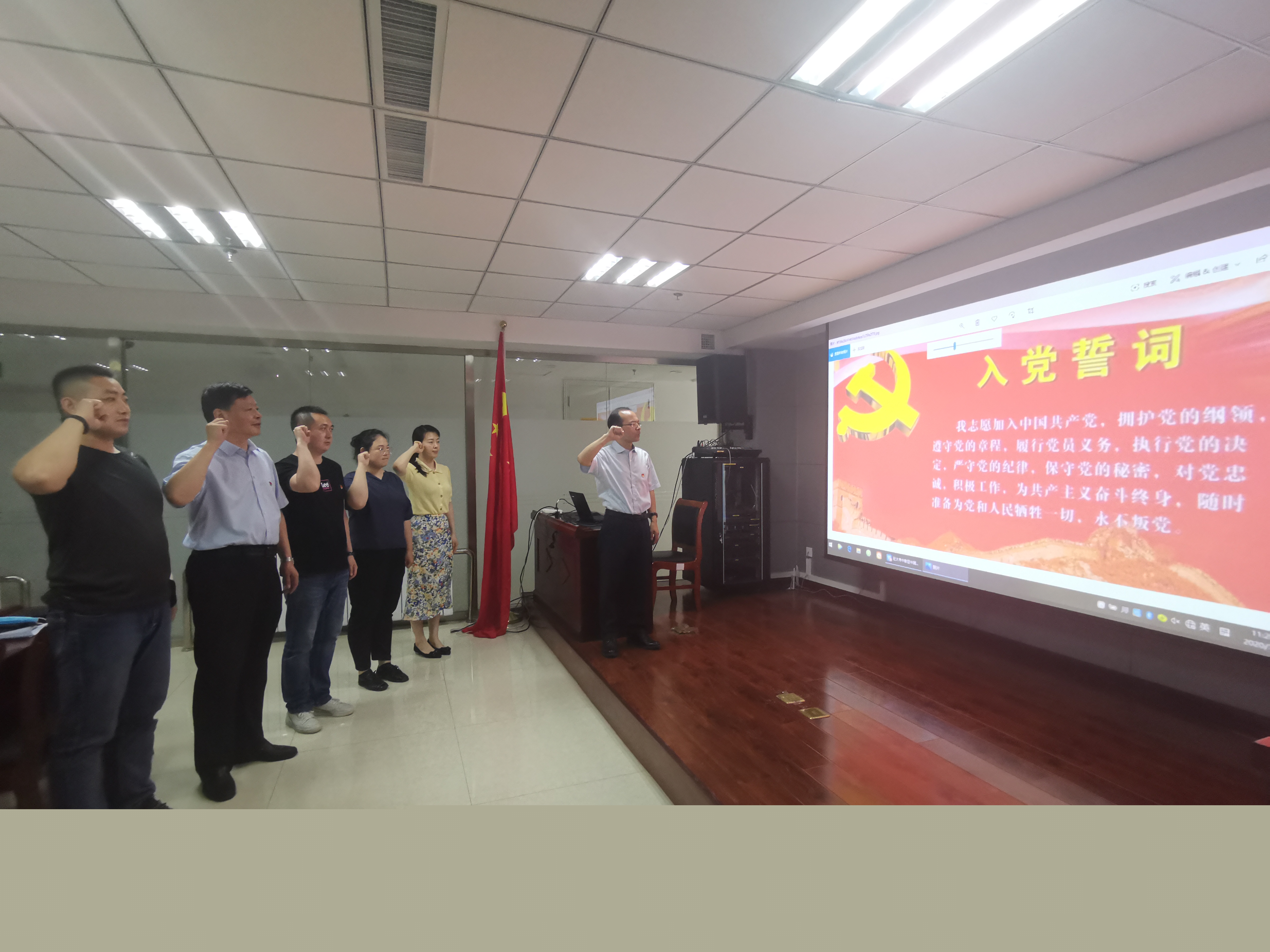 由黨支部書記焦俊良同志領(lǐng)誓,全體黨員面對(duì)鮮紅的黨旗,舉起右拳,莊嚴(yán)宣誓?!拔倚模何抑驹讣尤胫袊?guó)共產(chǎn)黨,擁護(hù)黨的綱領(lǐng),遵守黨的章程,履行黨員義務(wù),執(zhí)行黨的決定,嚴(yán)守黨的紀(jì)律,保守黨的秘密,對(duì)黨忠誠(chéng),積極工作,為共產(chǎn)主義奮斗終身,隨時(shí)準(zhǔn)備為黨和人民犧牲一切,永不叛黨?!辩H鏘有力的誓言,讓每名黨員受到了一次深刻的黨性教育和政治靈魂洗禮。
